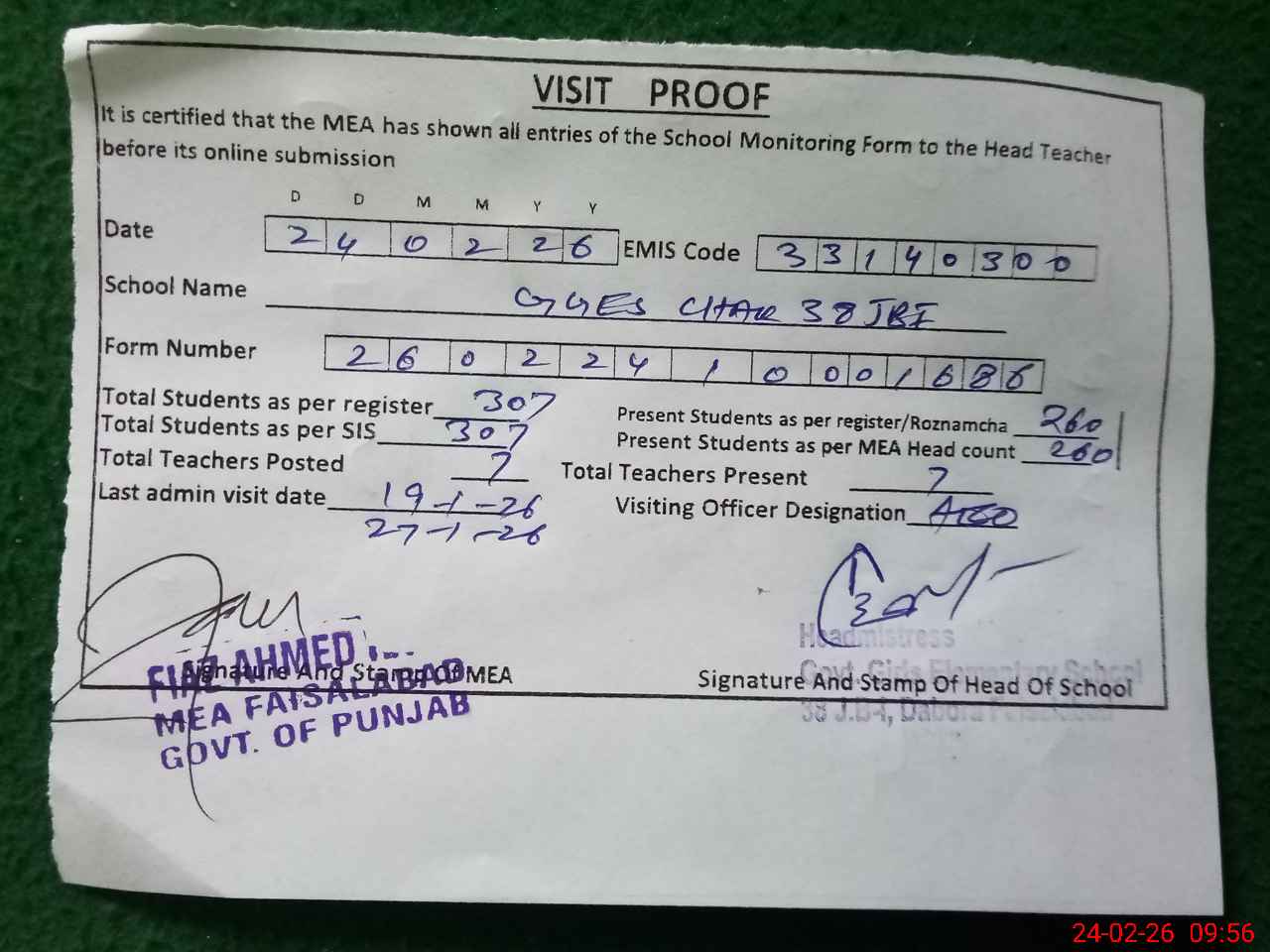 | Certified that this School was Inspected by the Undersigned MEA/DMO Today and the Information Stated Above is as Per Record. | |||||