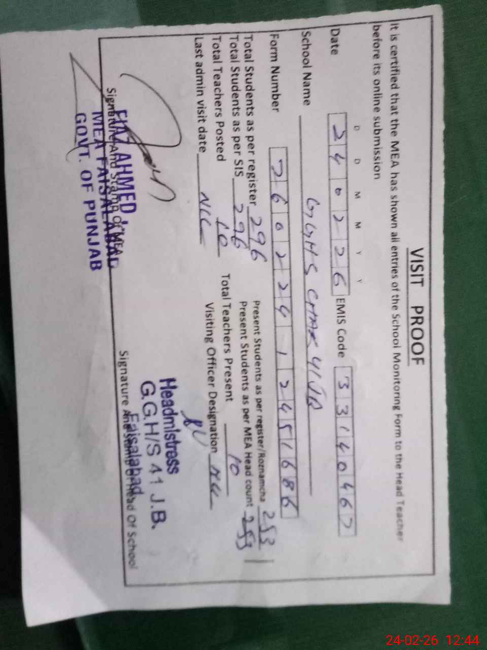 | Certified that this School was Inspected by the Undersigned MEA/DMO Today and the Information Stated Above is as Per Record. | |||||