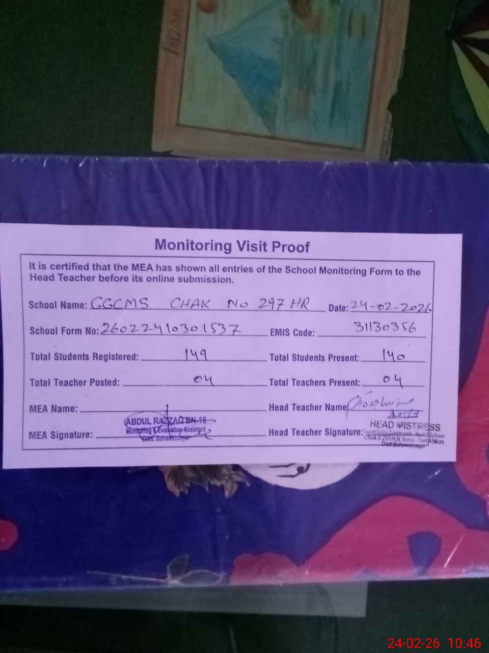 | EMIS Code: 31130356 | Name of School: GGCMS CHAK NO. 297/HR | |||