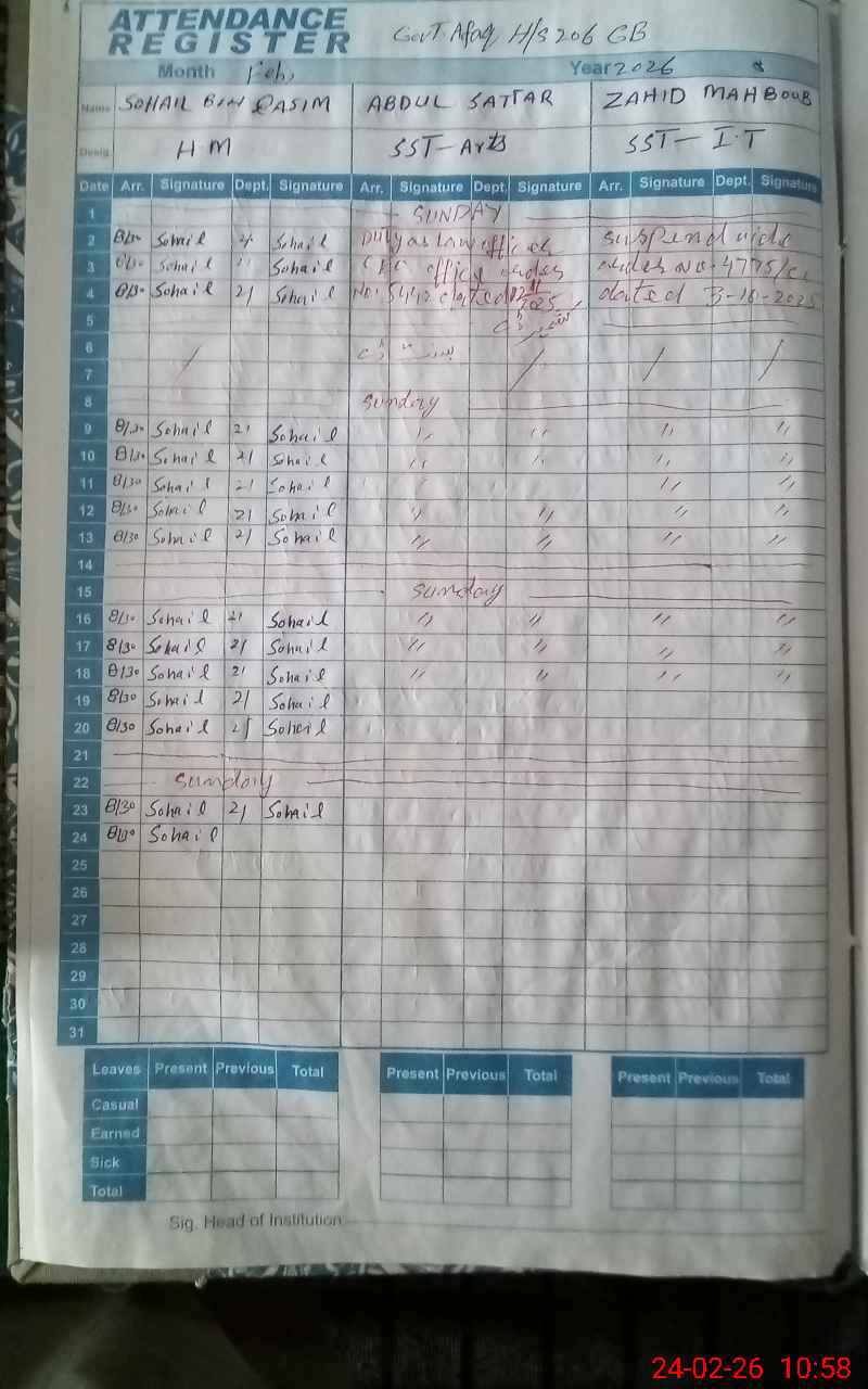 | Remarks (Use Separate Page if Required): NO WASHROOM FUNCTIONAL OUT OF 05. NO SOAP AT ANY POINT POOR CLEANING OF TOILETS. POOR CLASSROOM. POOR CLEANING OF LAWNS. BUILDING POOR.08XCLASSROOMS DANGEROUS. BOUNDARY WALL NON FUNCTIONAL. NO DRINKING WATER. NO FTF CASHBOOK MAINTAINED. NO SCHOOL TAB PROVIDED AT THE TIME OF VISIT. NO FREE TEXT BOOKS OF ANY CLASS PROVIDED. NO VISOTER BOOK PROVIDED. STUDENT ATTENDANCE LOW AS 96 PRESENT OUT OF 195. NO ROZNAMACHA MAINTAINED. SINGLE ONE BENCH/DESK OF ANY CLASS SERVICEABLE. EST GHULAM QADIR OF CLASS-8 WEARING JEANS AND T-SHIRT WHICH SHOWING POOR ATTITUDE OF TEACHER TOWARDS STUDIES AND POOR DISCIPLINE. ATTENDANCE REGISTER OF ANY CLASS MAINTAINED SINCE OCTOBER 2025 | |||||
