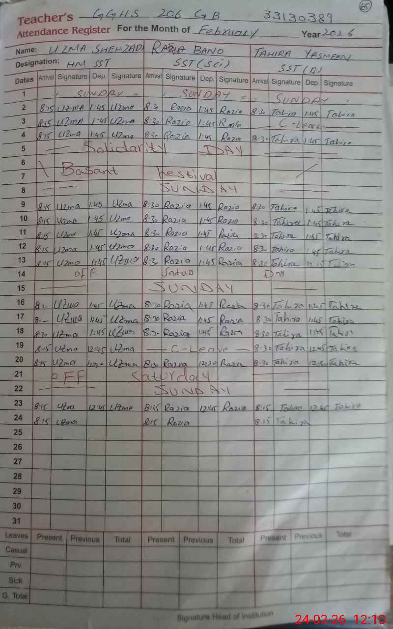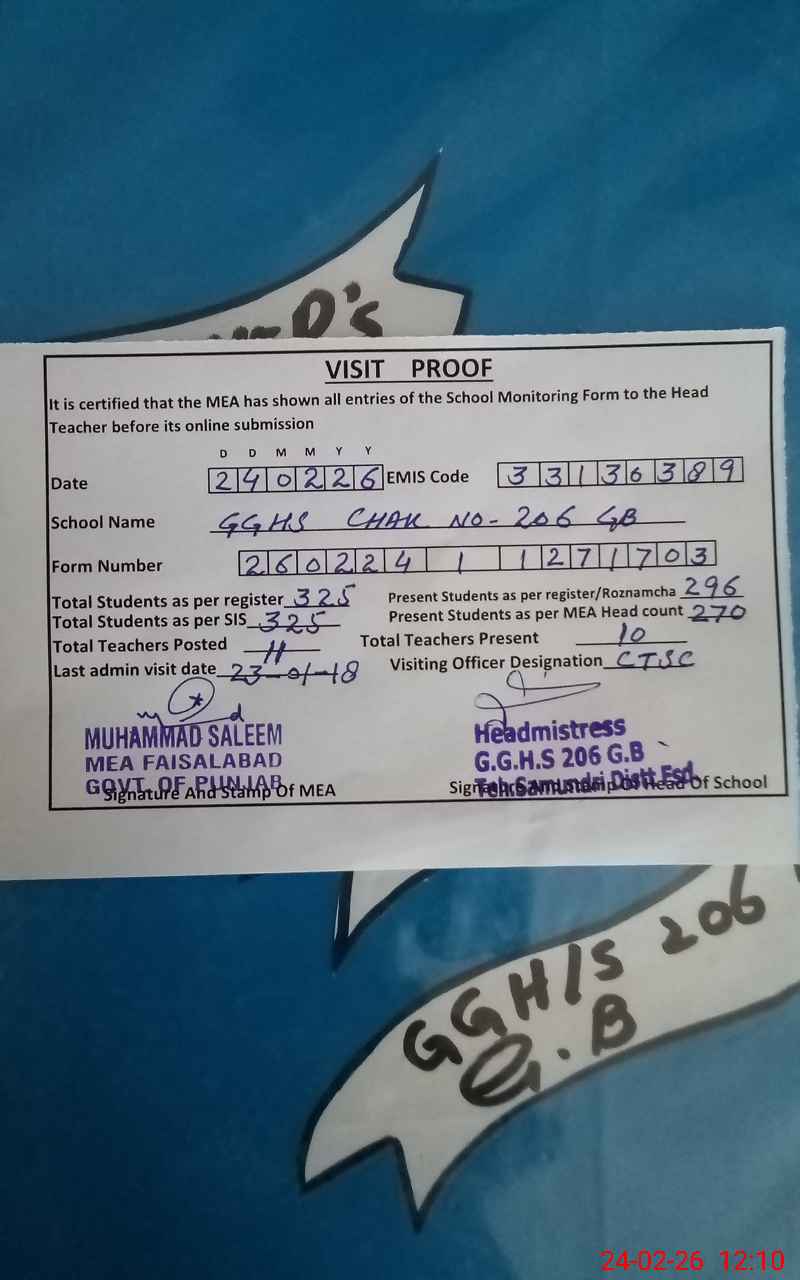 | EMIS Code: 33130389 | Name of School: GGHS CHAK NO 206 GB | |||