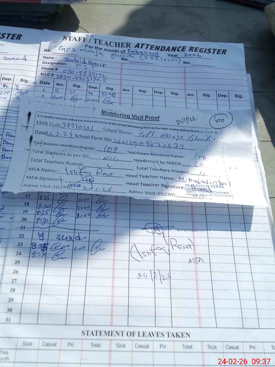 | Attendance Register | Head Teacher | MEA with School | Visit Proof |