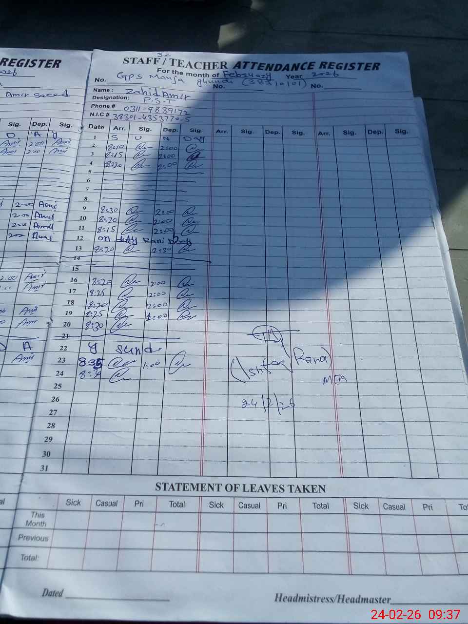 | Name: Mu**** Am**** Designation: (School Headmaster's/Headmistress's) HEADMASTER Phone/Cell Number: 03**** |