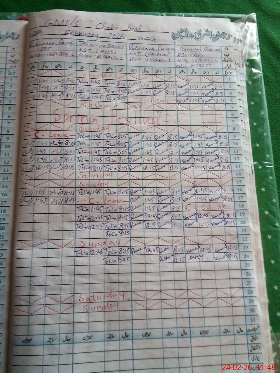 | Leave | Duty | Absent | Maternity | Medical | Ex- Pak |