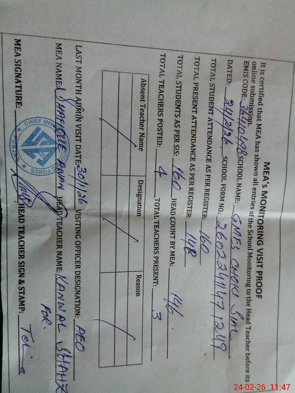 | Attendance Register | Head Teacher | MEA with School | Visit Proof |