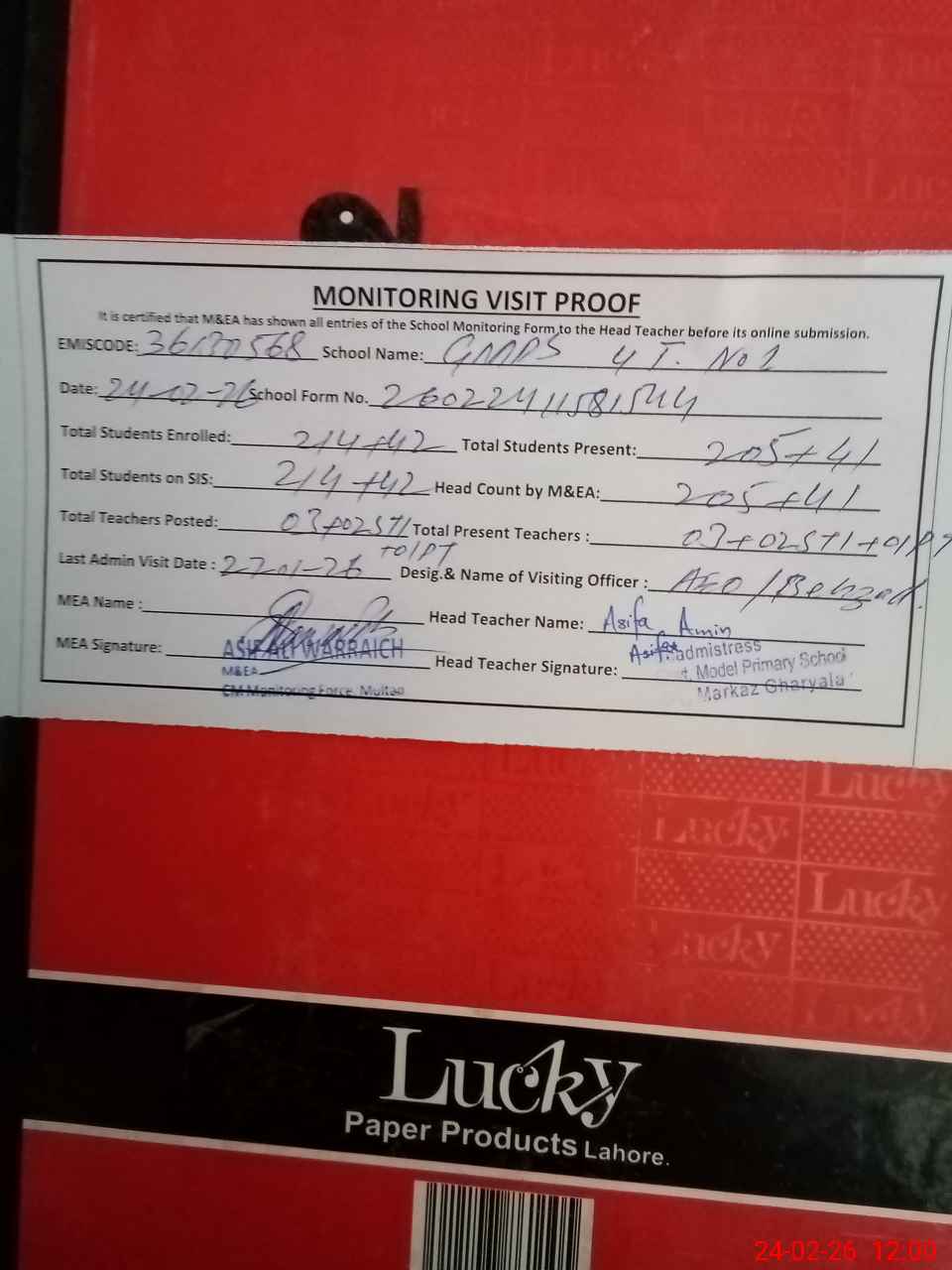 | EMIS Code: 36130568 | Name of School: GMPS CHAK 4-T P/O NO.1 MR | |||