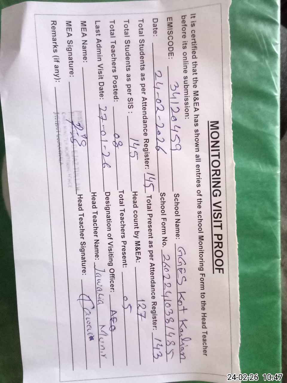 | Attendance Register | Head Teacher | MEA with School | Visit Proof |