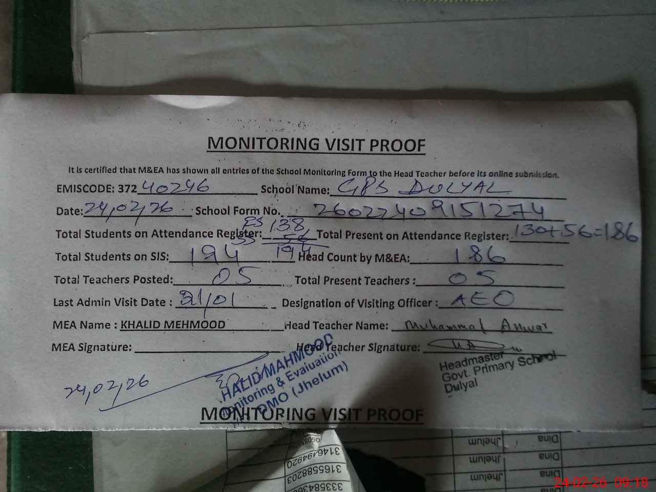 | Attendance Register | Head Teacher | MEA with School | Visit Proof |