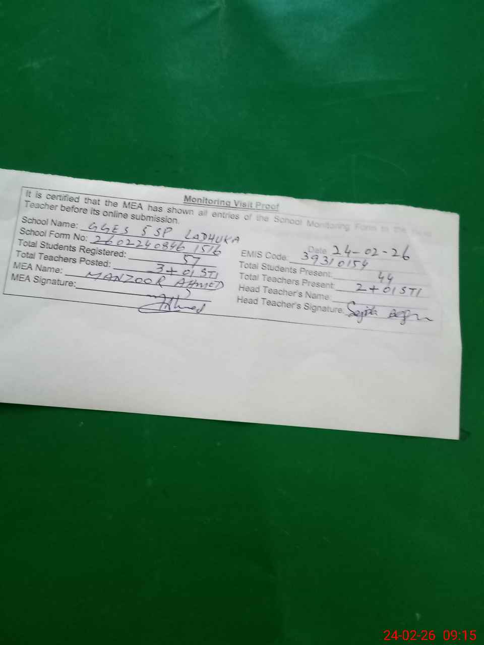 | Monitoring Date: 24-02-2026 | Start Time: 24-02-2026 08:44 AM | End Time: 24-02-2026 09:16 AM | Name of MEA: MA**** AH**** | |