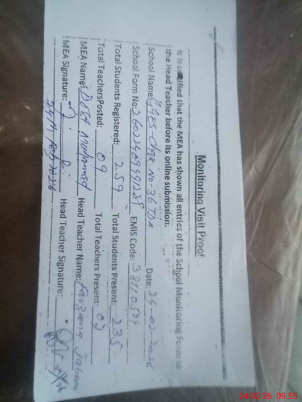 | Certified that this School was Inspected by the Undersigned MEA/DMO Today and the Information Stated Above is as Per Record. | |||||