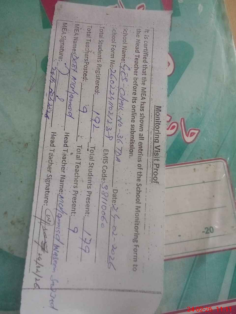 | Attendance Register | Head Teacher | MEA with School | Visit Proof |