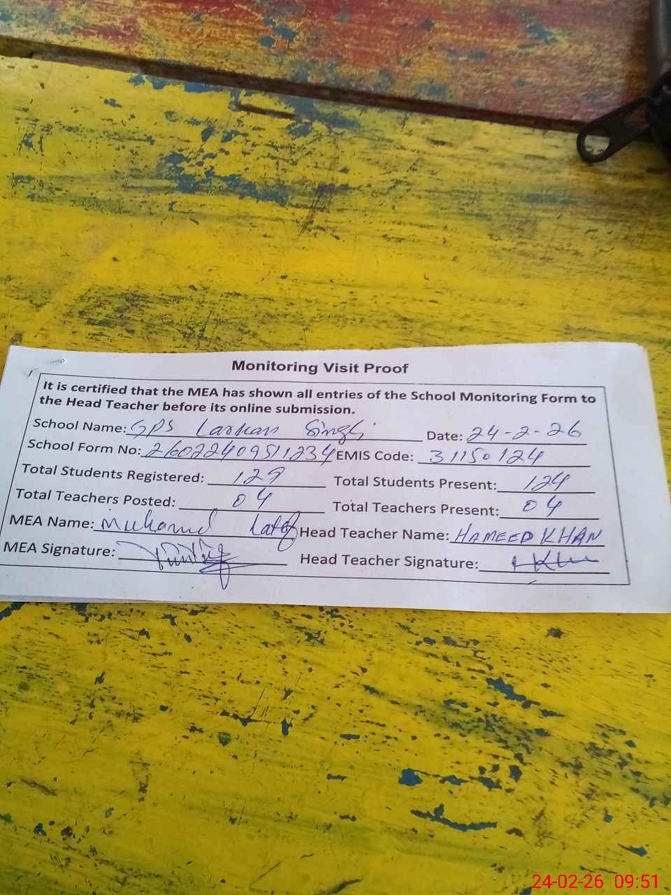 | Attendance Register | Head Teacher | MEA with School | Visit Proof |