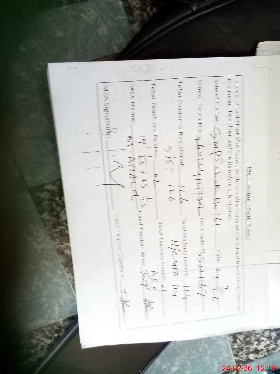 | Attendance Register | Head Teacher | MEA with School | Visit Proof |