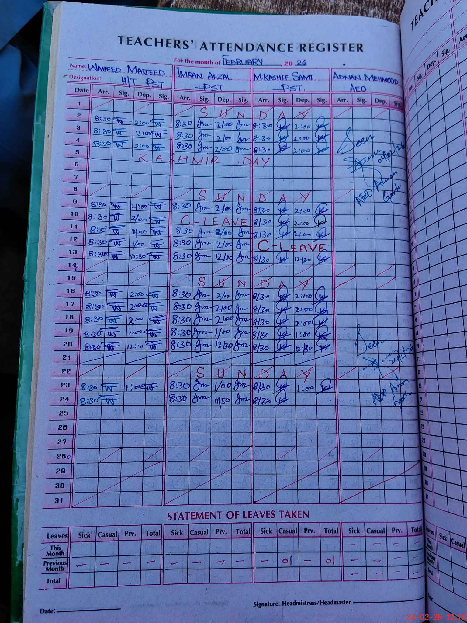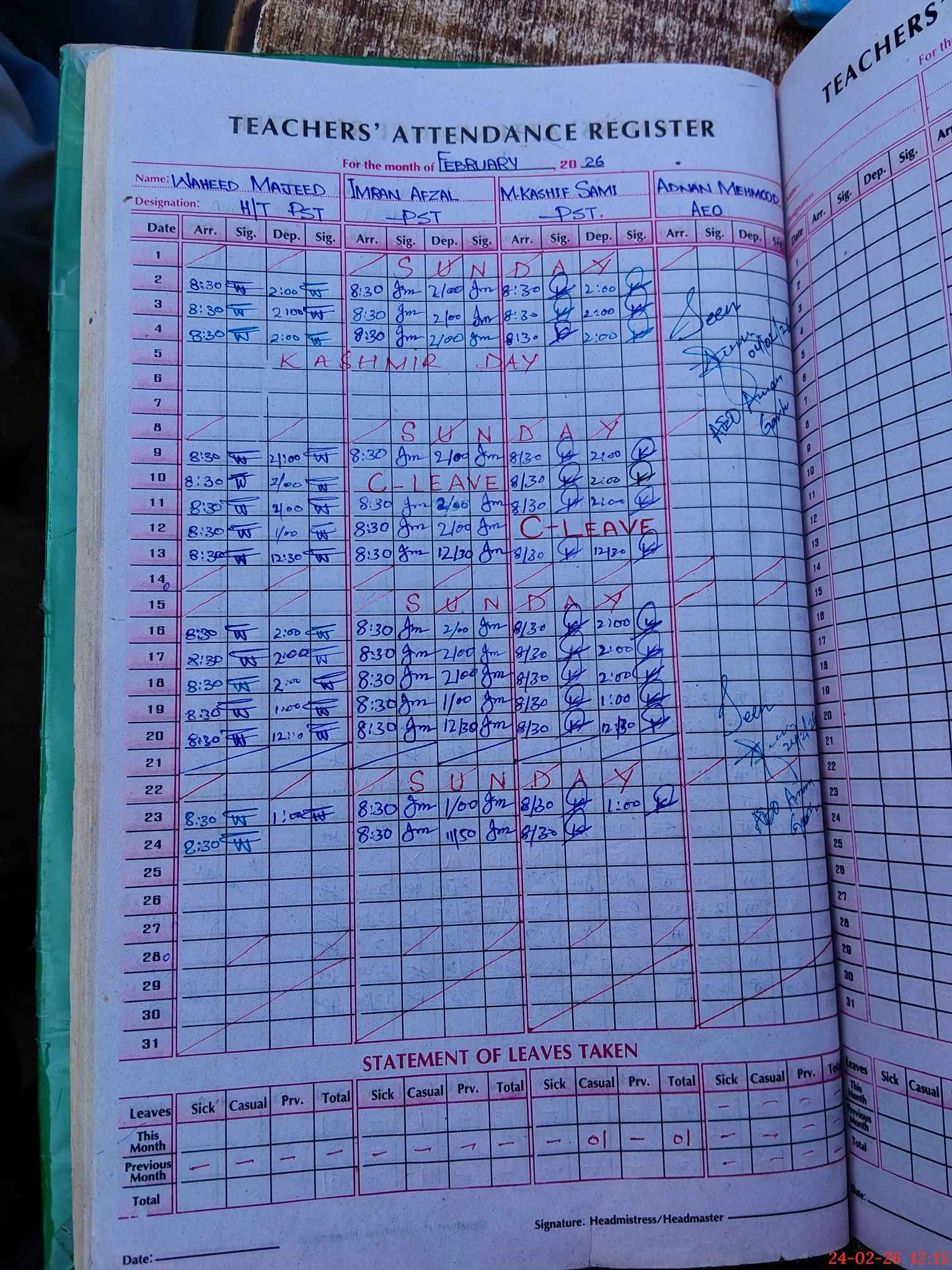 | CNIC | Full Name | Designation | R/C | Absence During Last Calender Month |