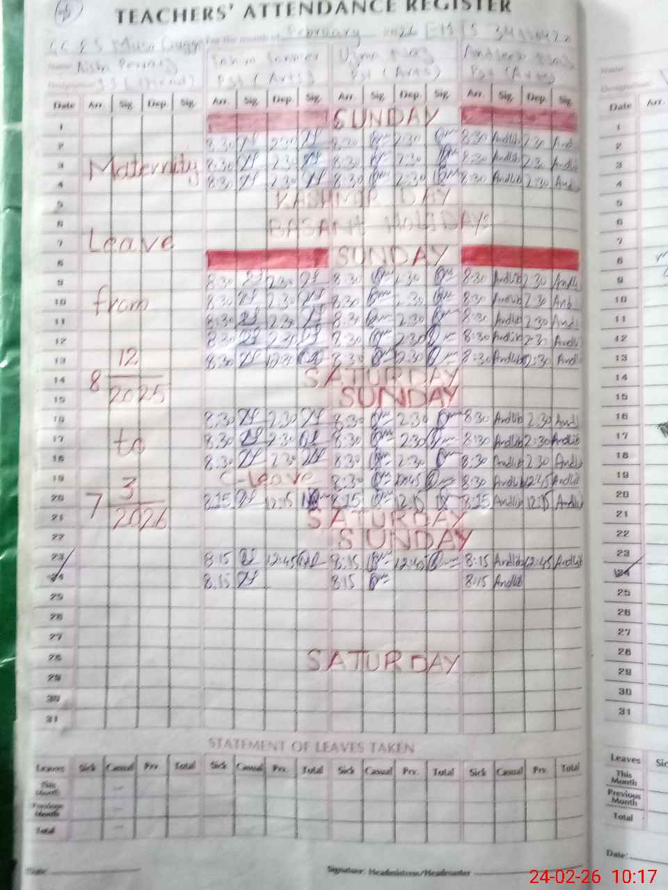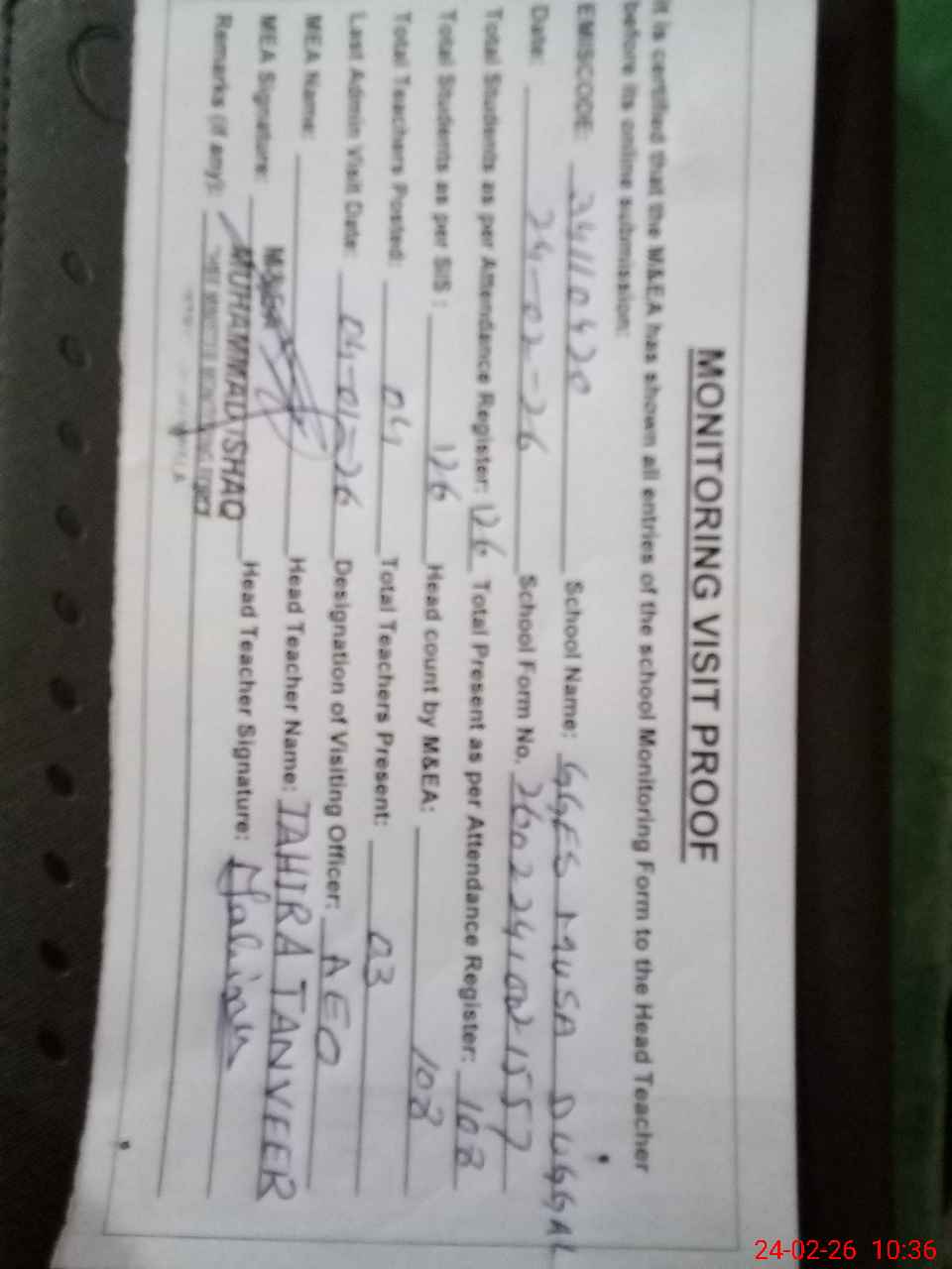 | Remarks (Use Separate Page if Required): SSE AISHA PERVAIZ (HEAD TEACHER) IS ABSENT FROM SCHOOL NO APPROVED LEAVE RECORD SEEN FROM 08 DECEMBER 2025 Verify 12/12 STUDENTS OF CLASS 07 FTF RECORD NOT SHOW DUE TO HEAD TEACHER IS NOT AVAILABLE | |||||