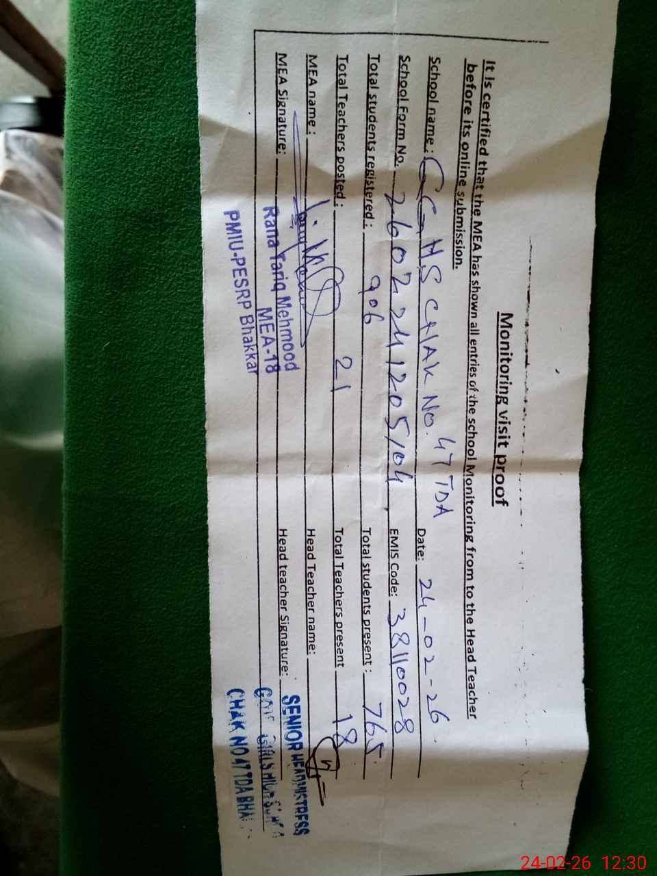 | Certified that this School was Inspected by the Undersigned MEA/DMO Today and the Information Stated Above is as Per Record. | |||||