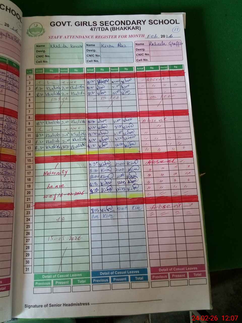 | CNIC | Full Name | Designation | R/C | Absence During Last Calender Month |