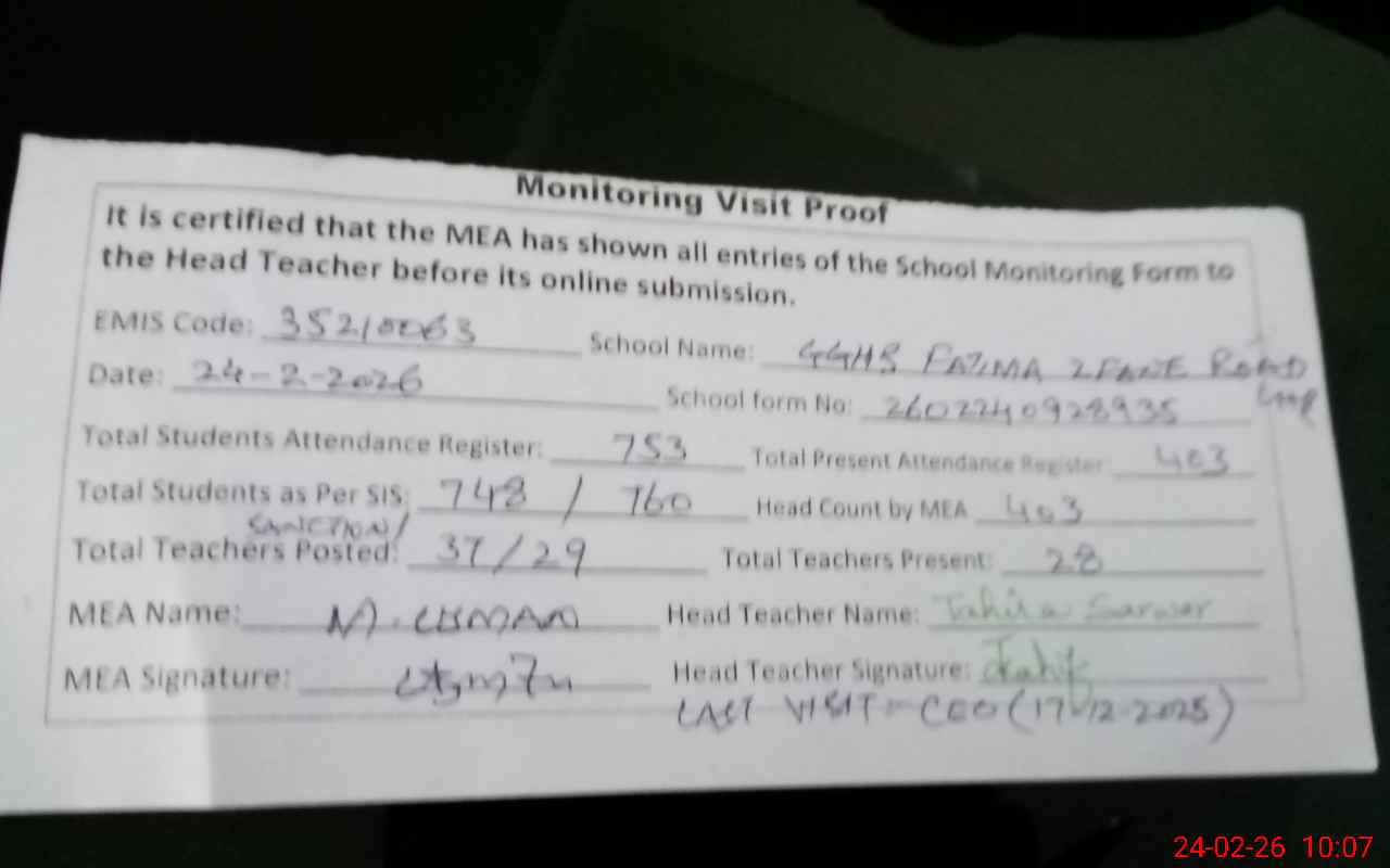 | Certified that this School was Inspected by the Undersigned MEA/DMO Today and the Information Stated Above is as Per Record. | |||||