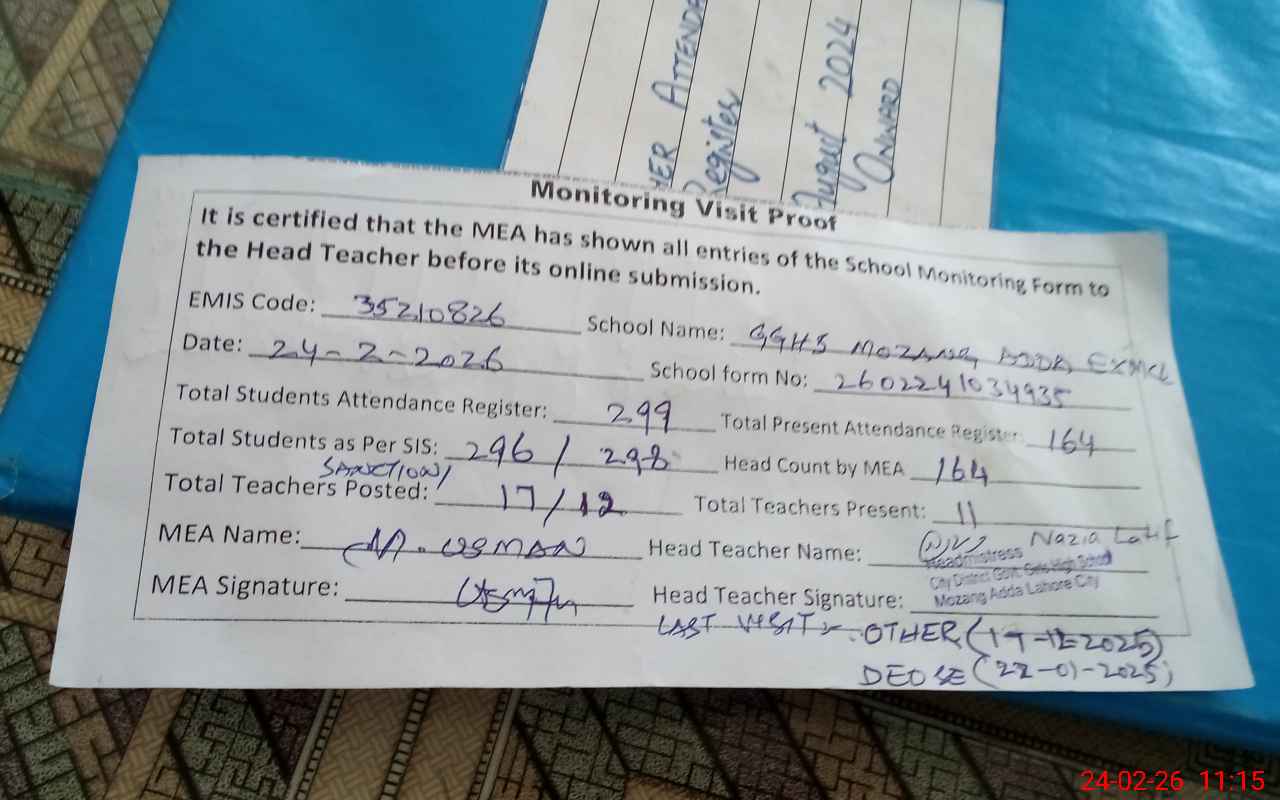 | Attendance Register | Head Teacher | MEA with School | Visit Proof |
