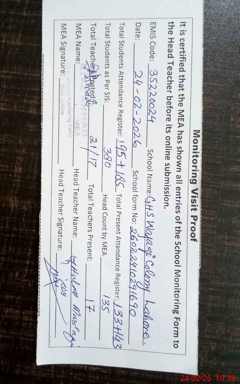 | EMIS Code: 35220024 | Name of School: GHS WAFAQI COLONY LAHORE | |||