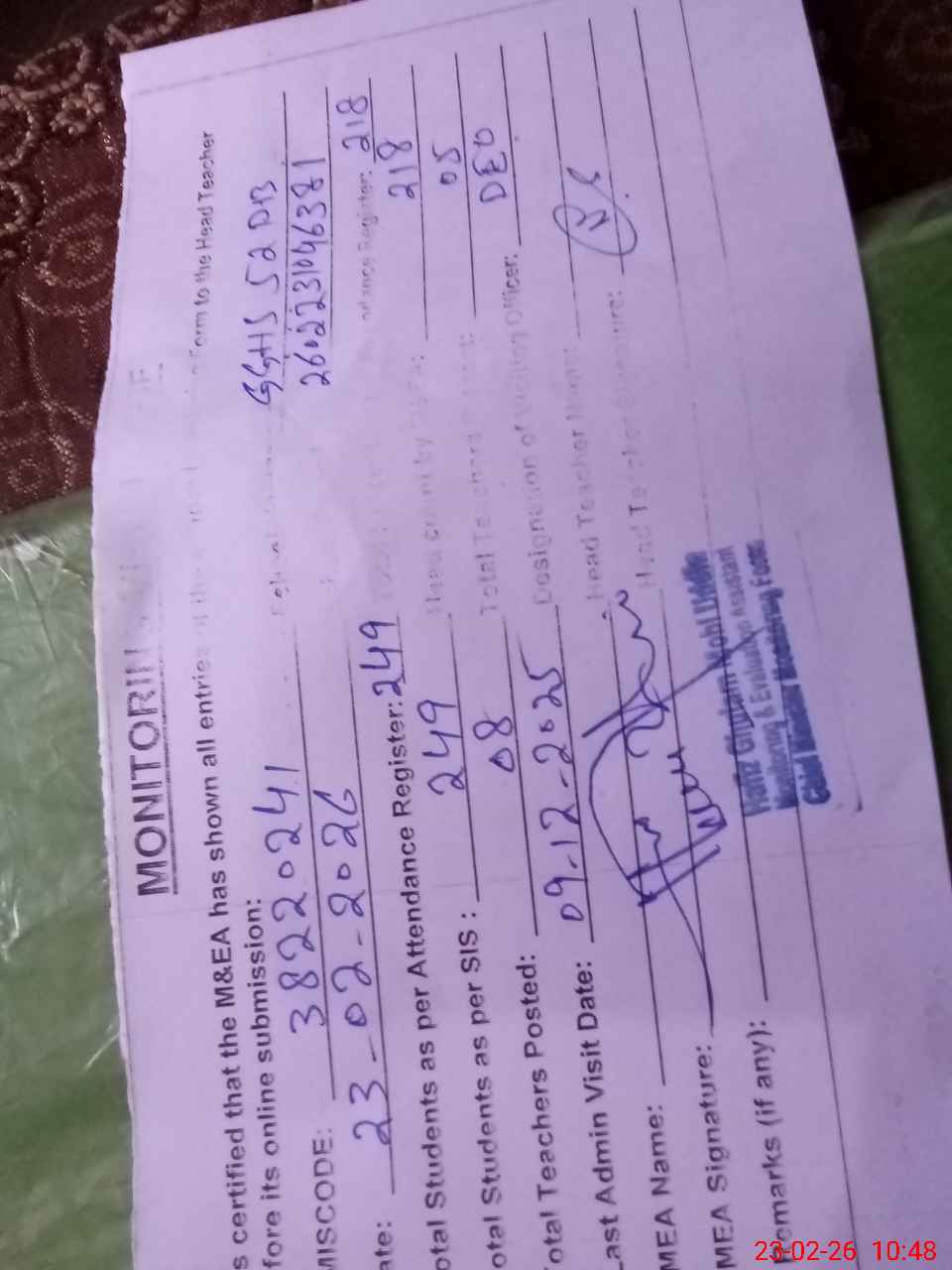 | Certified that this School was Inspected by the Undersigned MEA/DMO Today and the Information Stated Above is as Per Record. | |||||