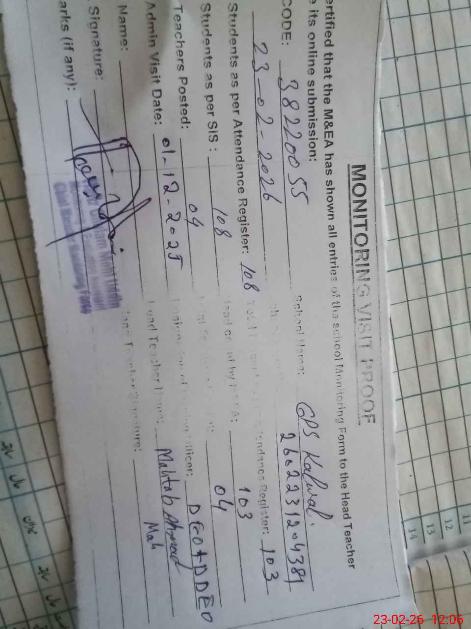 | Attendance Register | Head Teacher | MEA with School | Visit Proof |