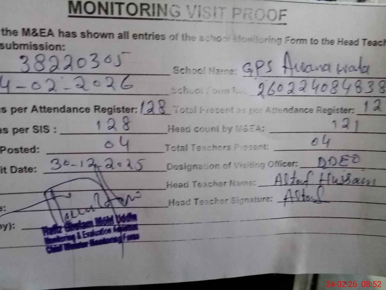 | Attendance Register | Head Teacher | MEA with School | Visit Proof |