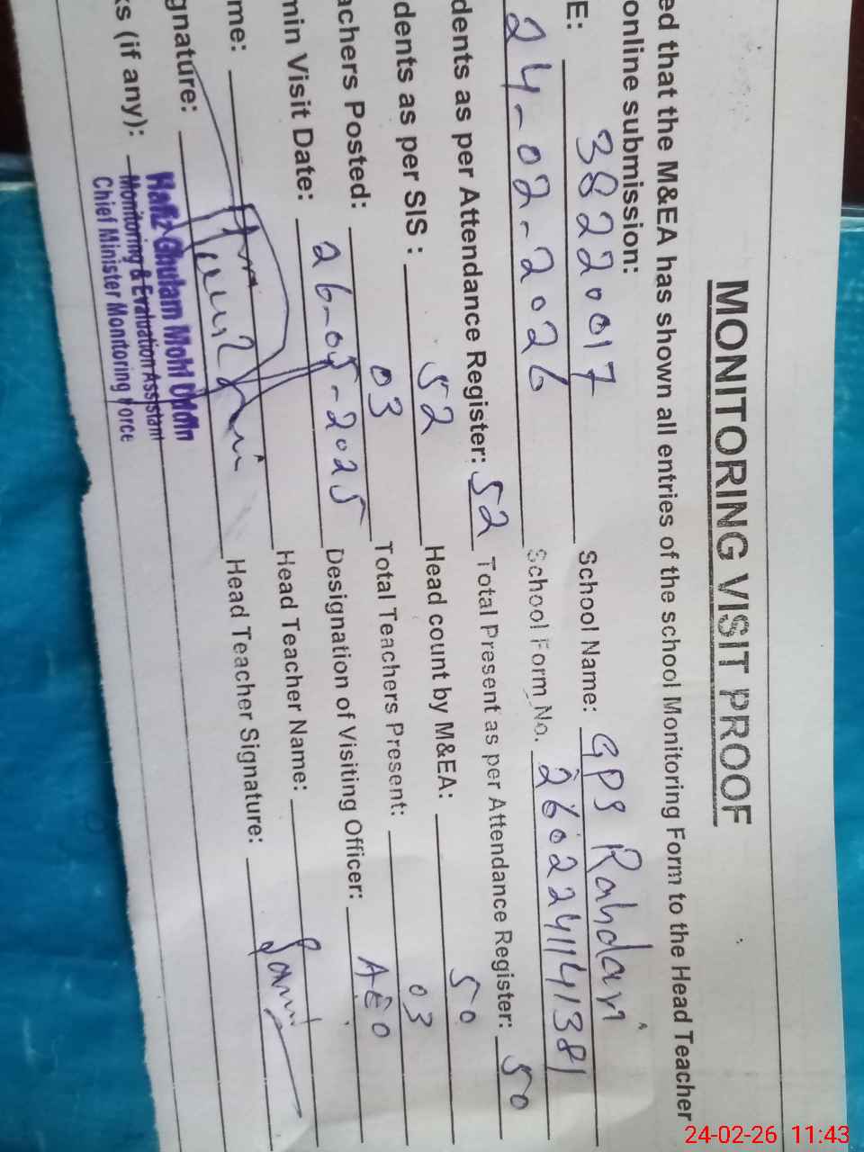 | Attendance Register | Head Teacher | MEA with School | Visit Proof |