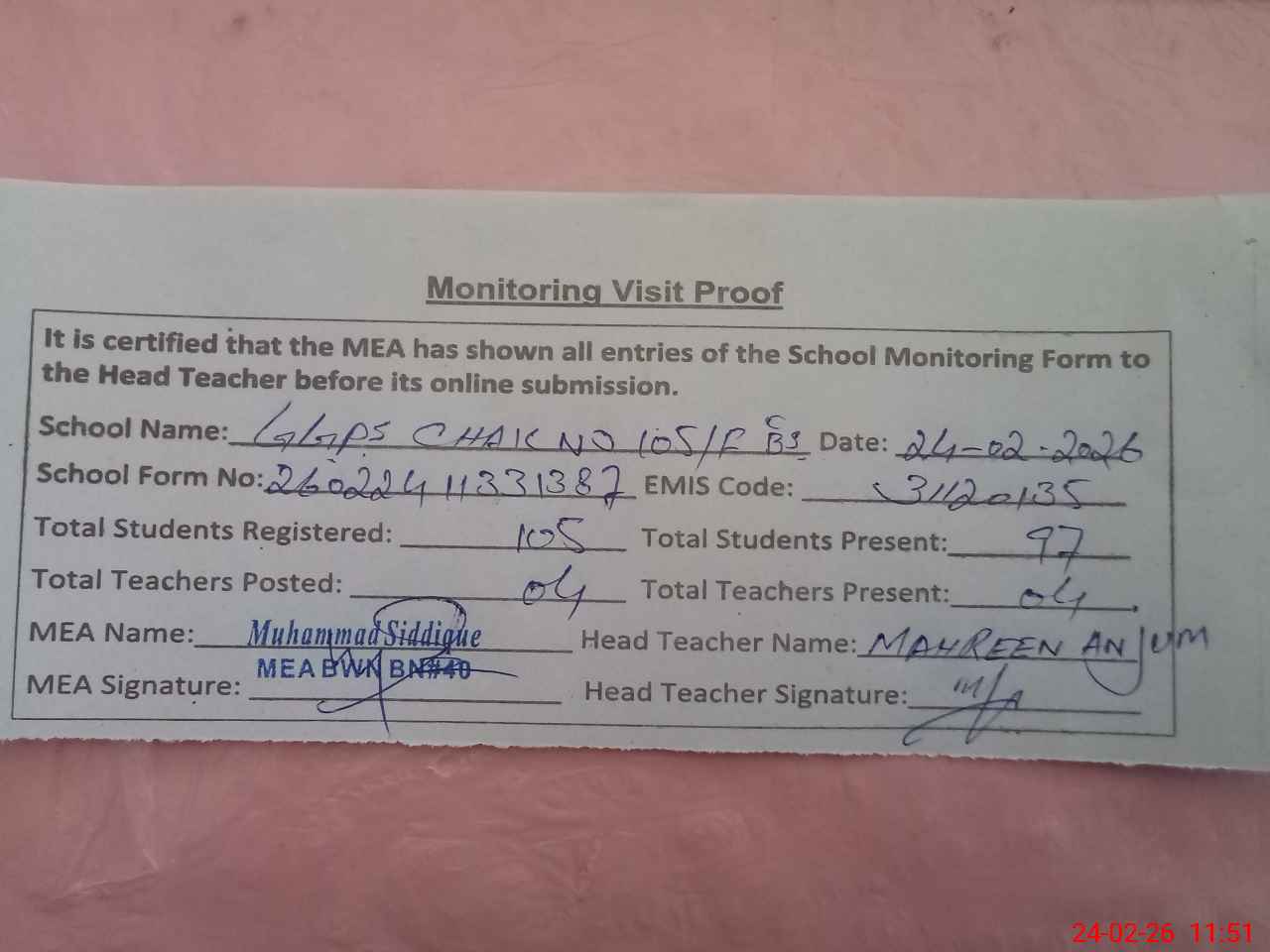| Attendance Register | Head Teacher | MEA with School | Visit Proof |