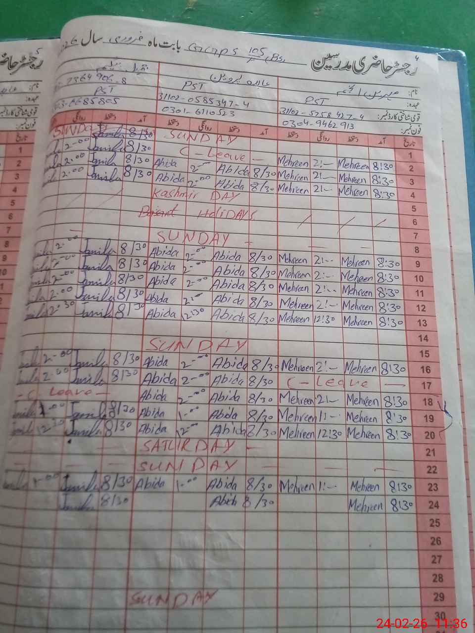 | CNIC | Full Name | Designation | R/C | Absence During Last Calender Month |