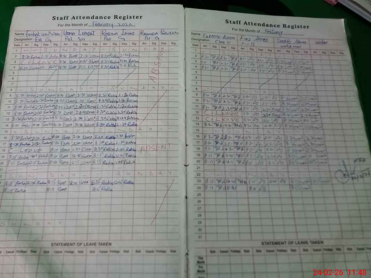 | Leave | Duty | Absent | Maternity | Medical | Ex- Pak |