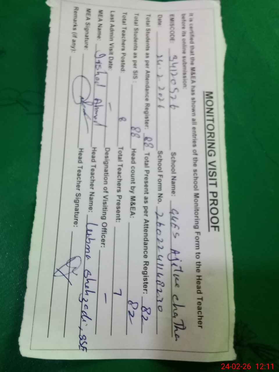 | Attendance Register | Head Teacher | MEA with School | Visit Proof |