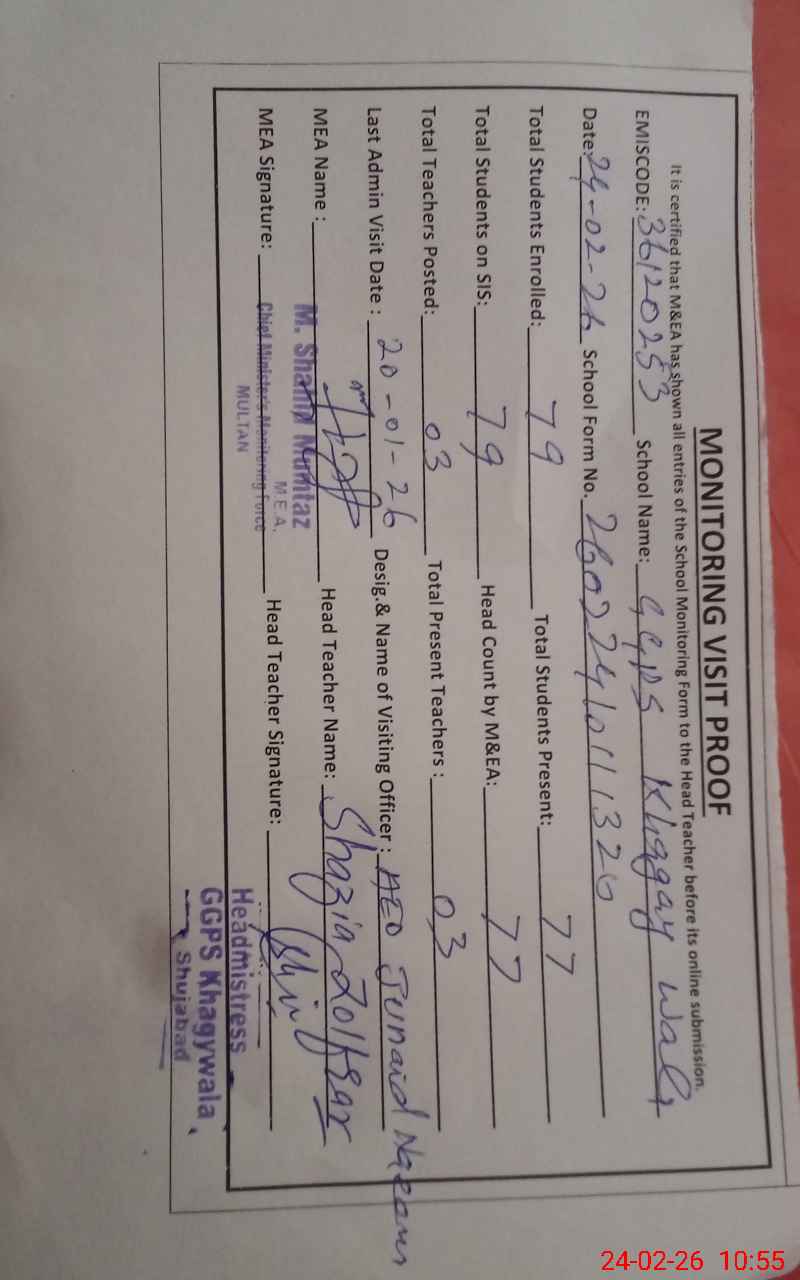 | EMIS Code: 36120253 | Name of School: GGPS KHAGAY WALA CHAH NAIB WALA SHUJABAD DISTT. MULTAN | |||