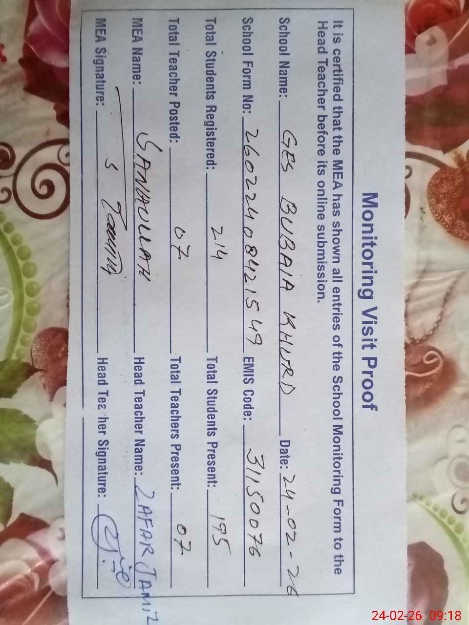 | Certified that this School was Inspected by the Undersigned MEA/DMO Today and the Information Stated Above is as Per Record. | |||||