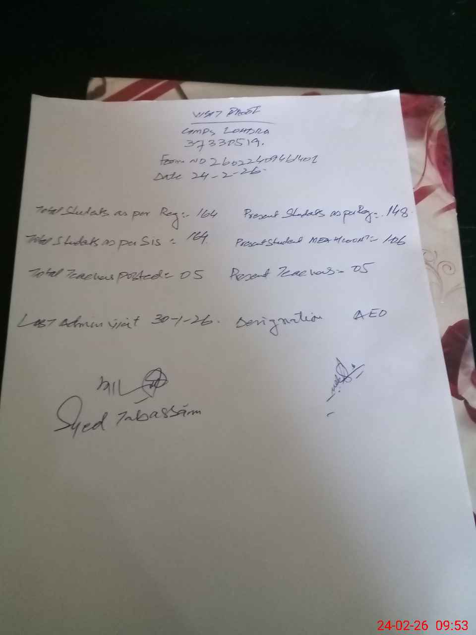 | Certified that this School was Inspected by the Undersigned MEA/DMO Today and the Information Stated Above is as Per Record. | |||||