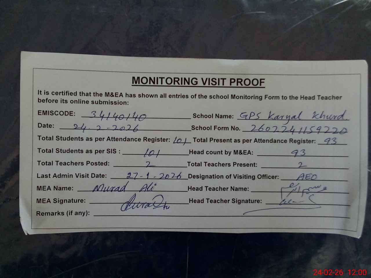 | EMIS Code: 34140140 | Name of School: GPS KARYAL KHURD | |||