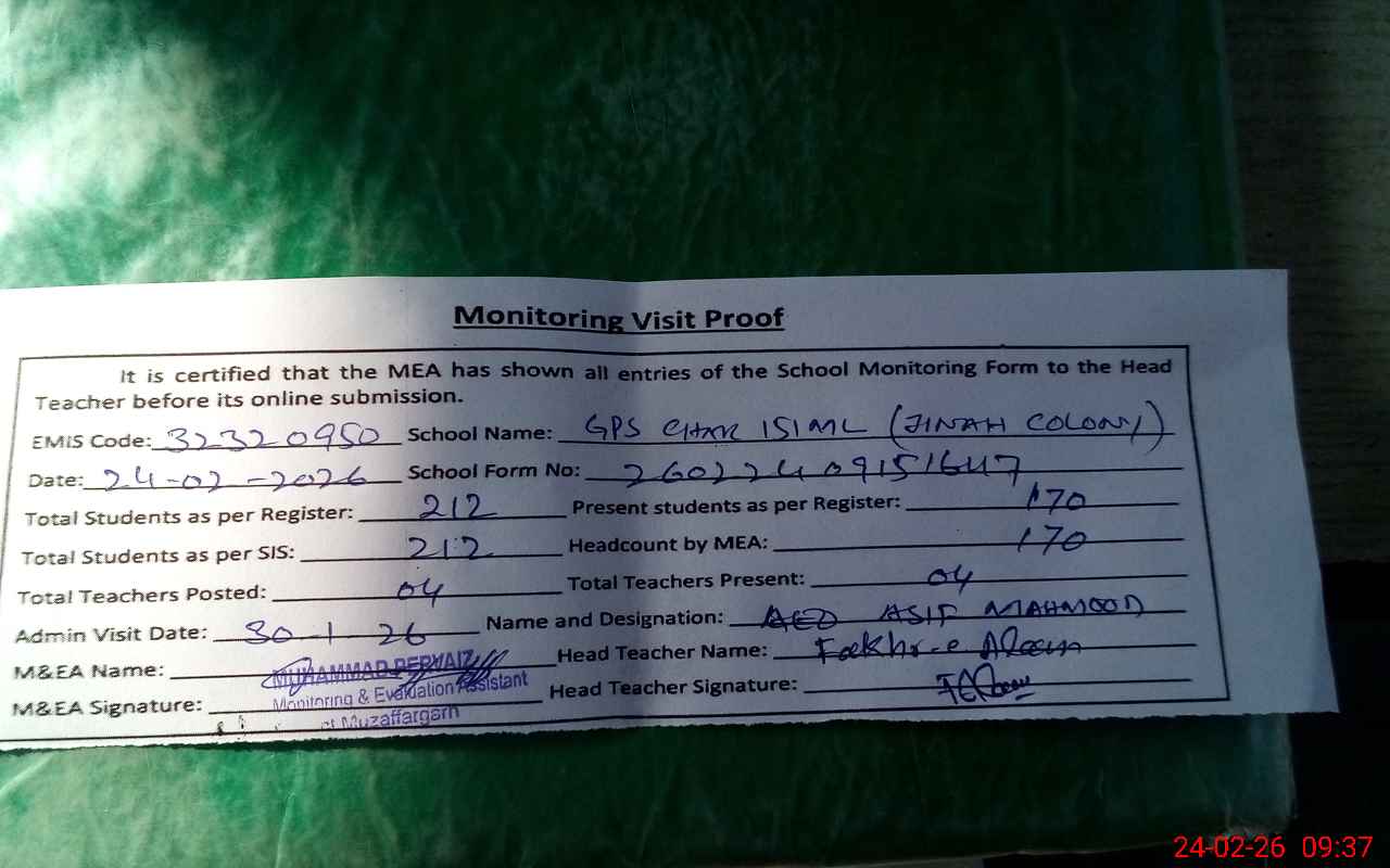 | EMIS Code: 32320950 | Name of School: GPS CHAK NO. 151 ML (JINNAH COLONY) | |||
