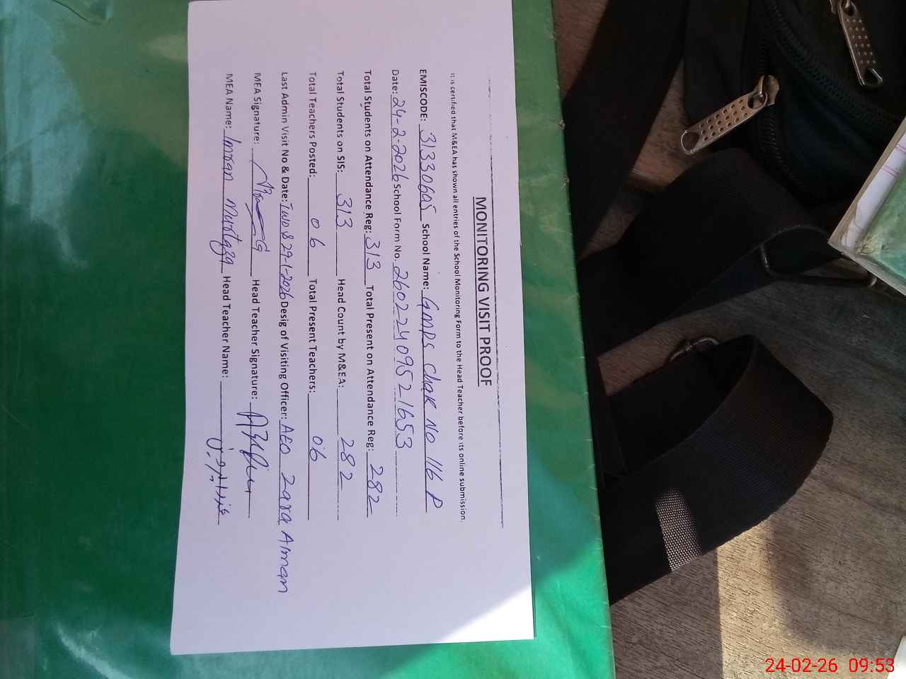 | Attendance Register | Head Teacher | MEA with School | Visit Proof |