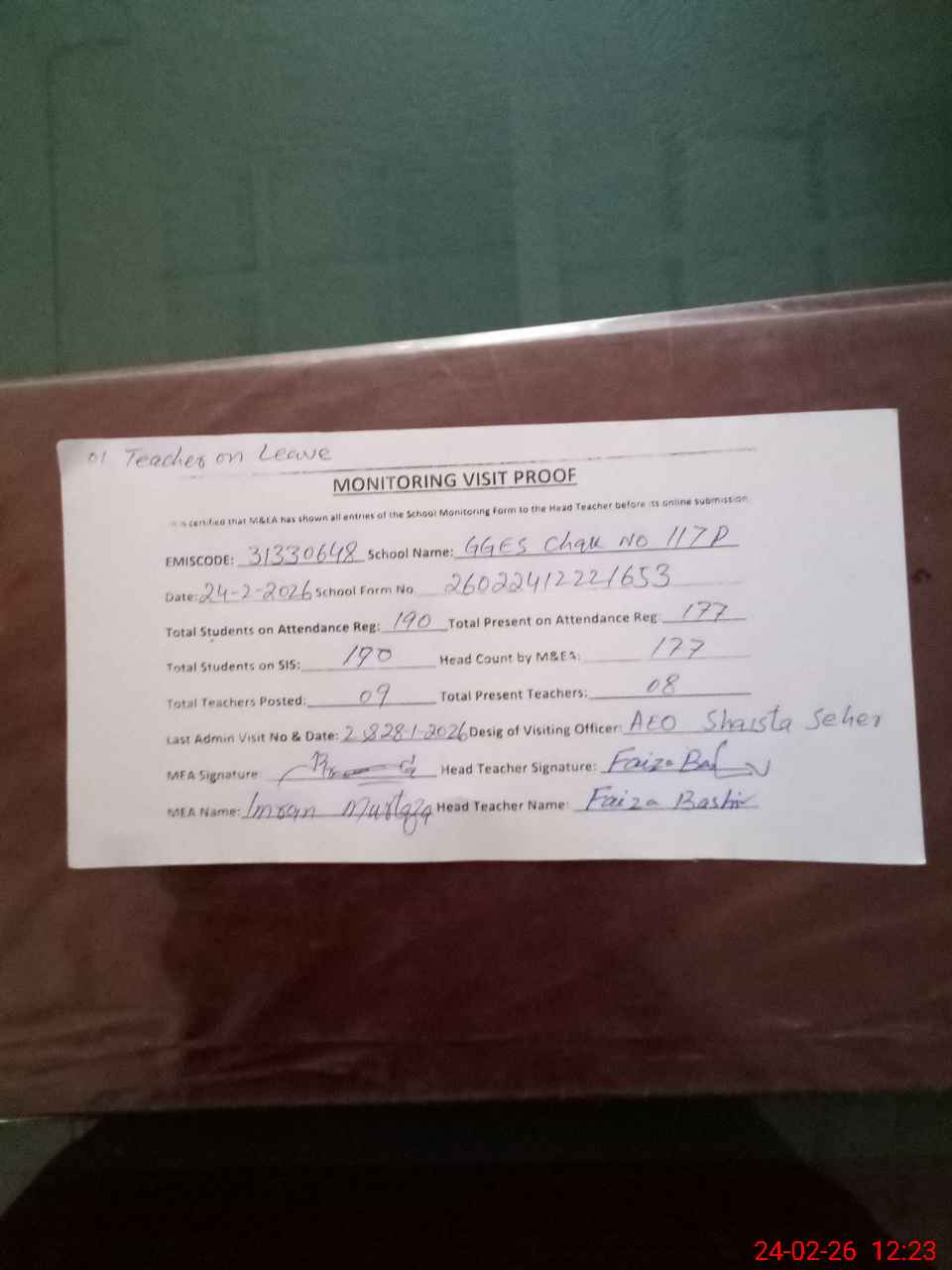 | Attendance Register | Head Teacher | MEA with School | Visit Proof |