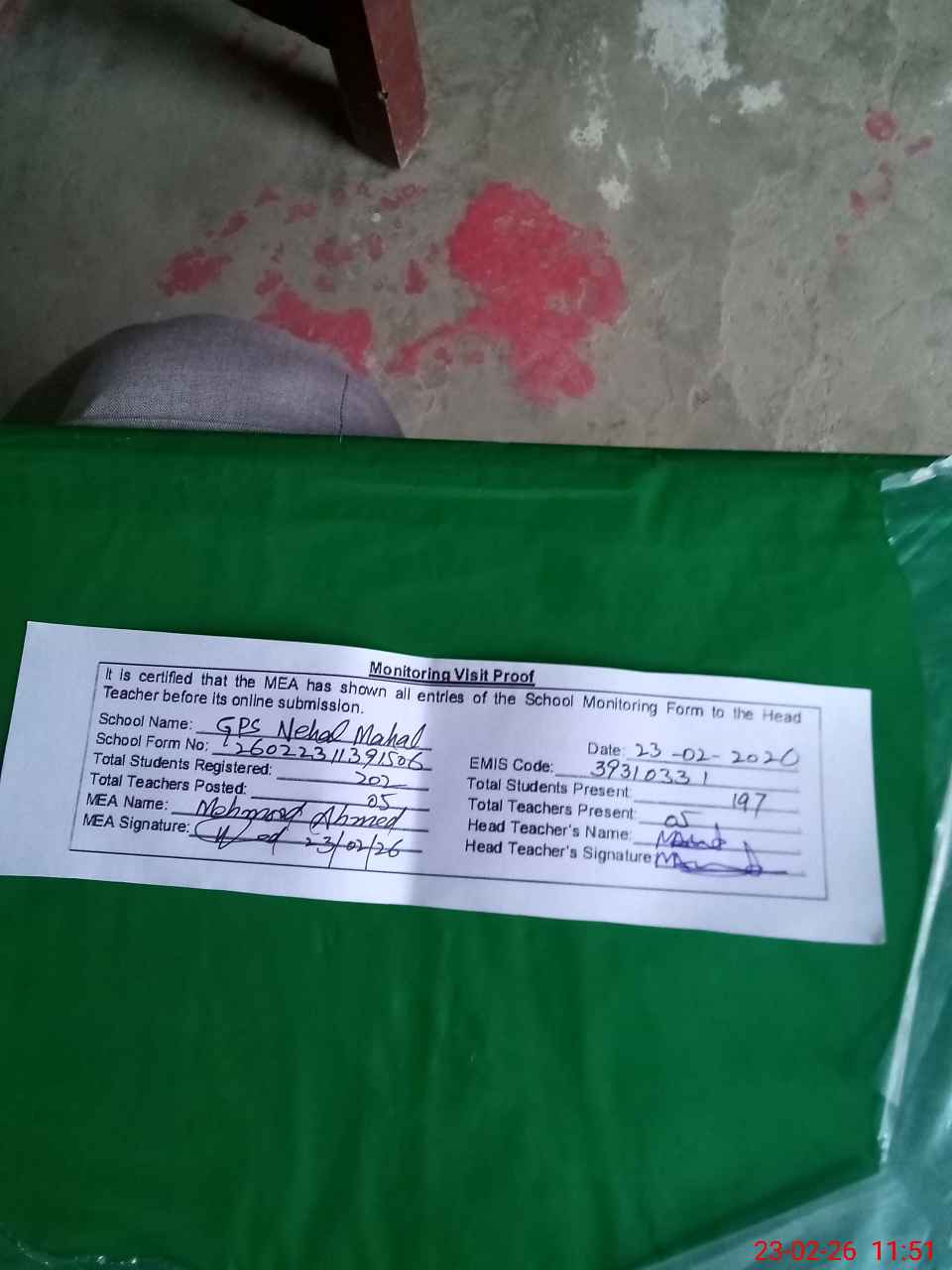 | Attendance Register | Head Teacher | MEA with School | Visit Proof |