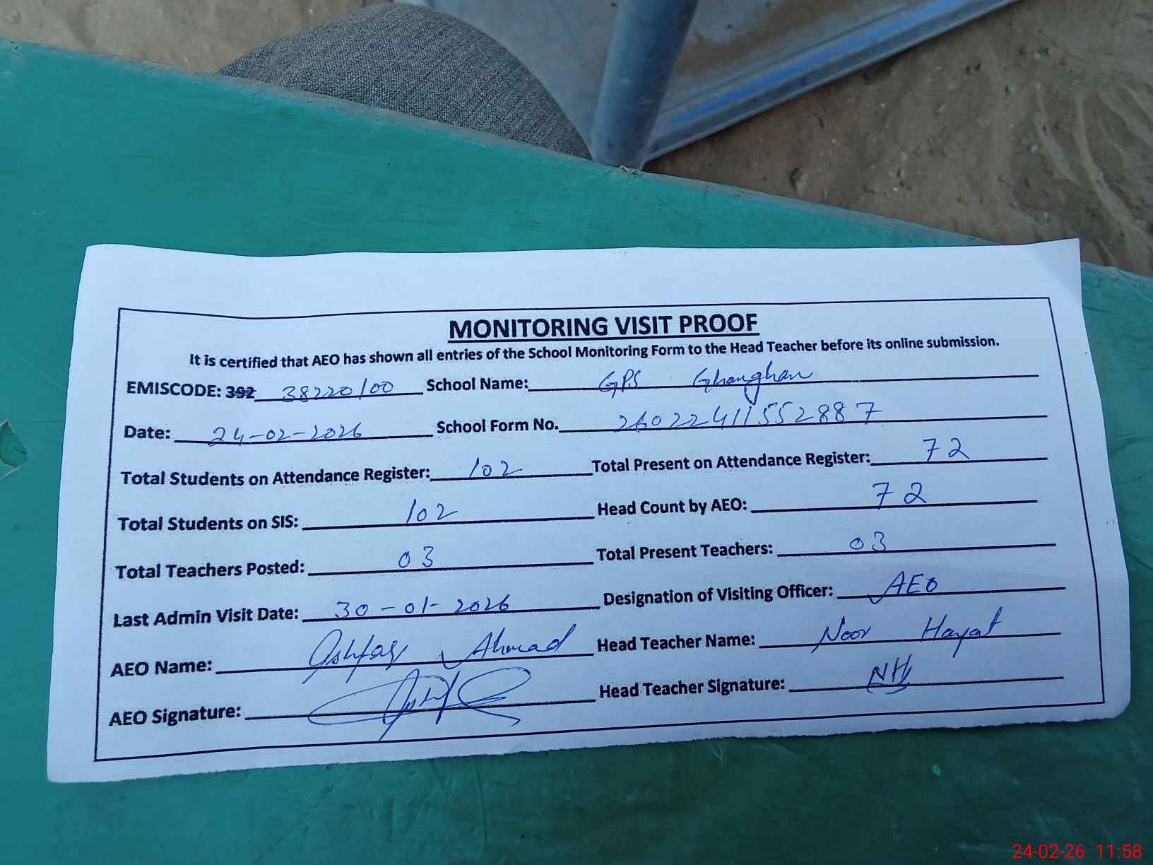| Attendance Register | Head Teacher | MEA with School | Visit Proof |