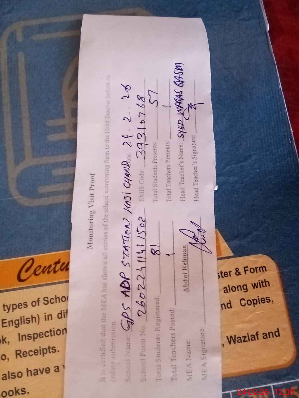 | Attendance Register | Head Teacher | MEA with School | Visit Proof |