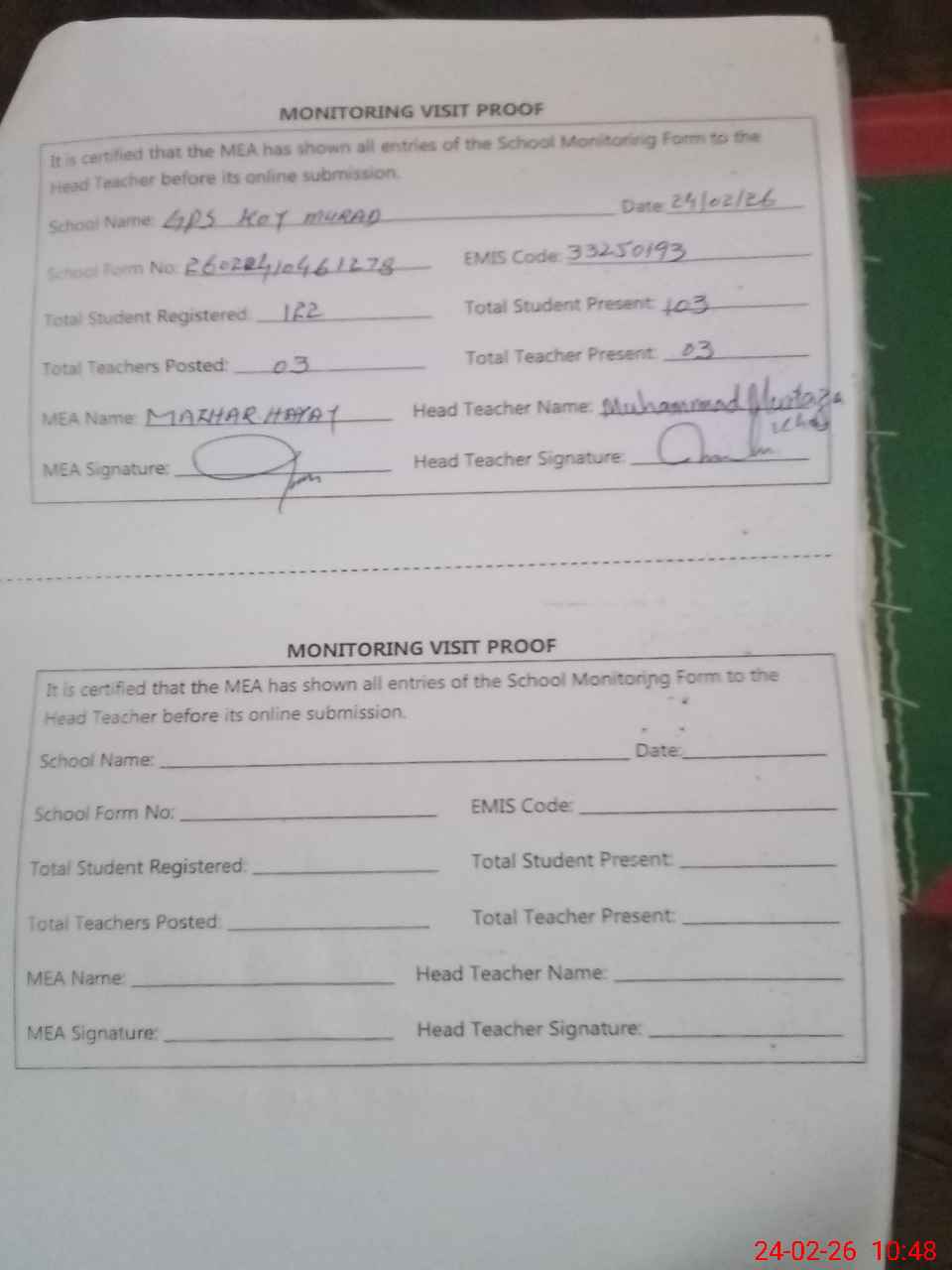 | EMIS Code: 33250193 | Name of School: GPS KOT MURAD | |||