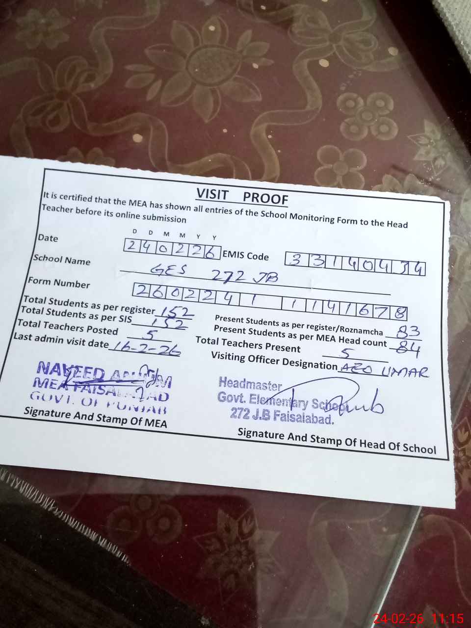 | Certified that this School was Inspected by the Undersigned MEA/DMO Today and the Information Stated Above is as Per Record. | |||||