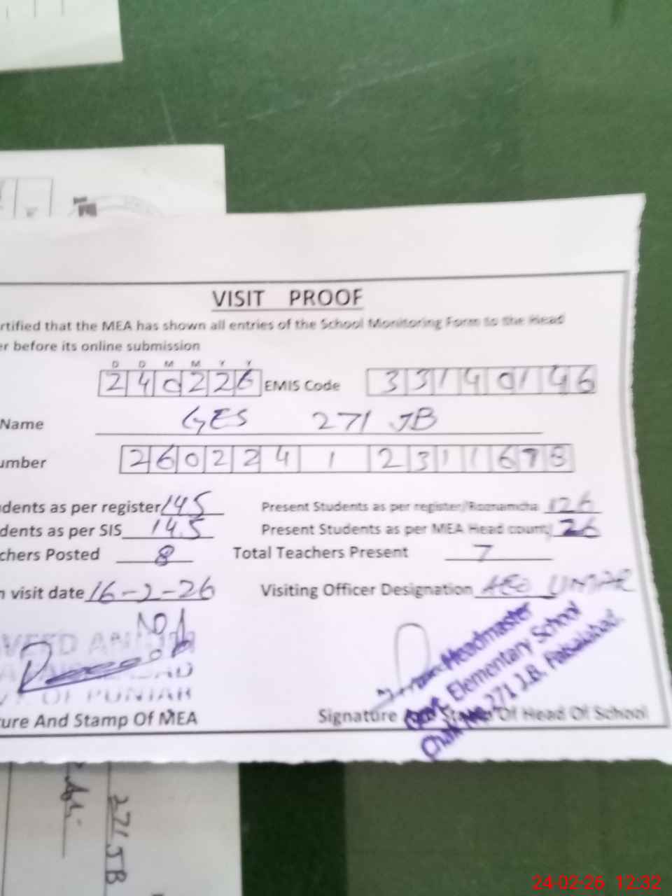 | Attendance Register | Head Teacher | MEA with School | Visit Proof |
