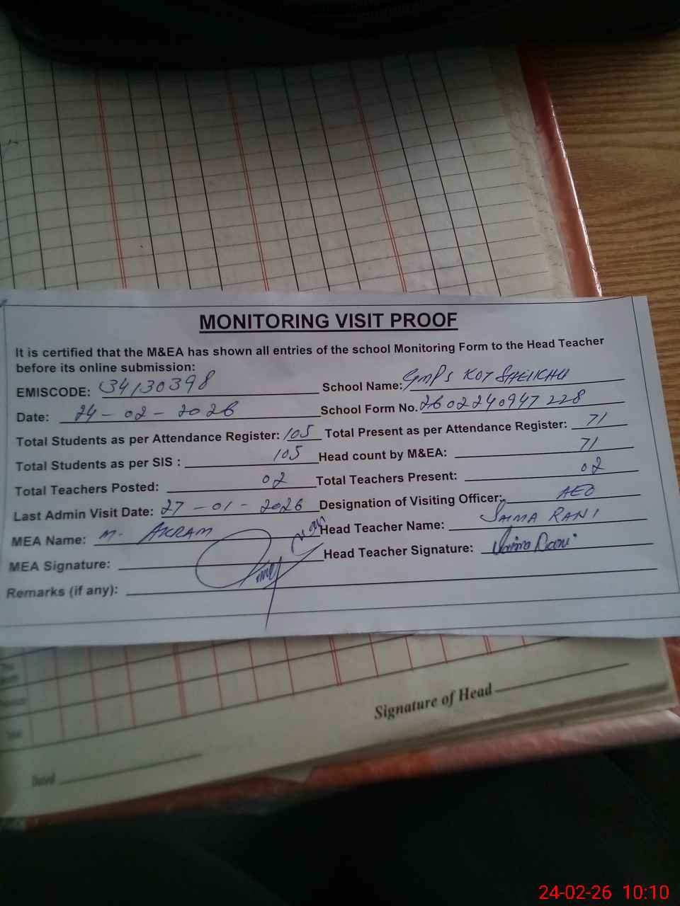 | Attendance Register | Head Teacher | MEA with School | Visit Proof |