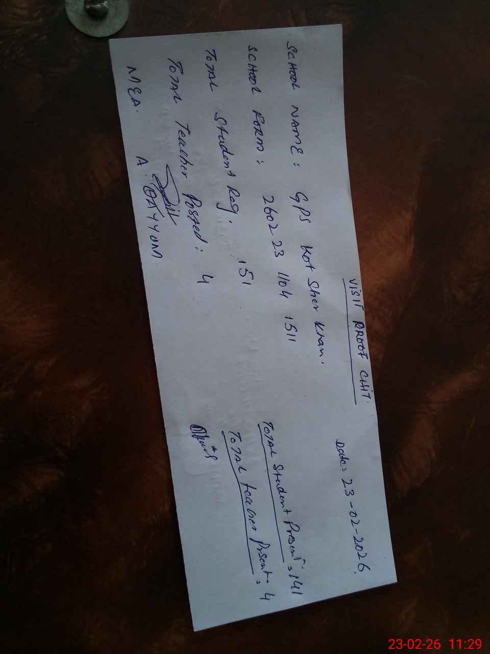 | Attendance Register | Head Teacher | MEA with School | Visit Proof |