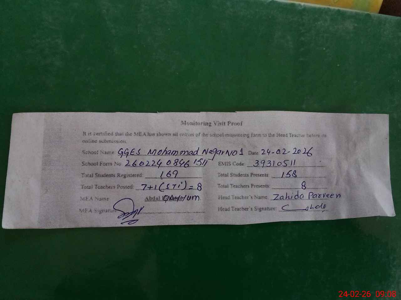 | Attendance Register | Head Teacher | MEA with School | Visit Proof |