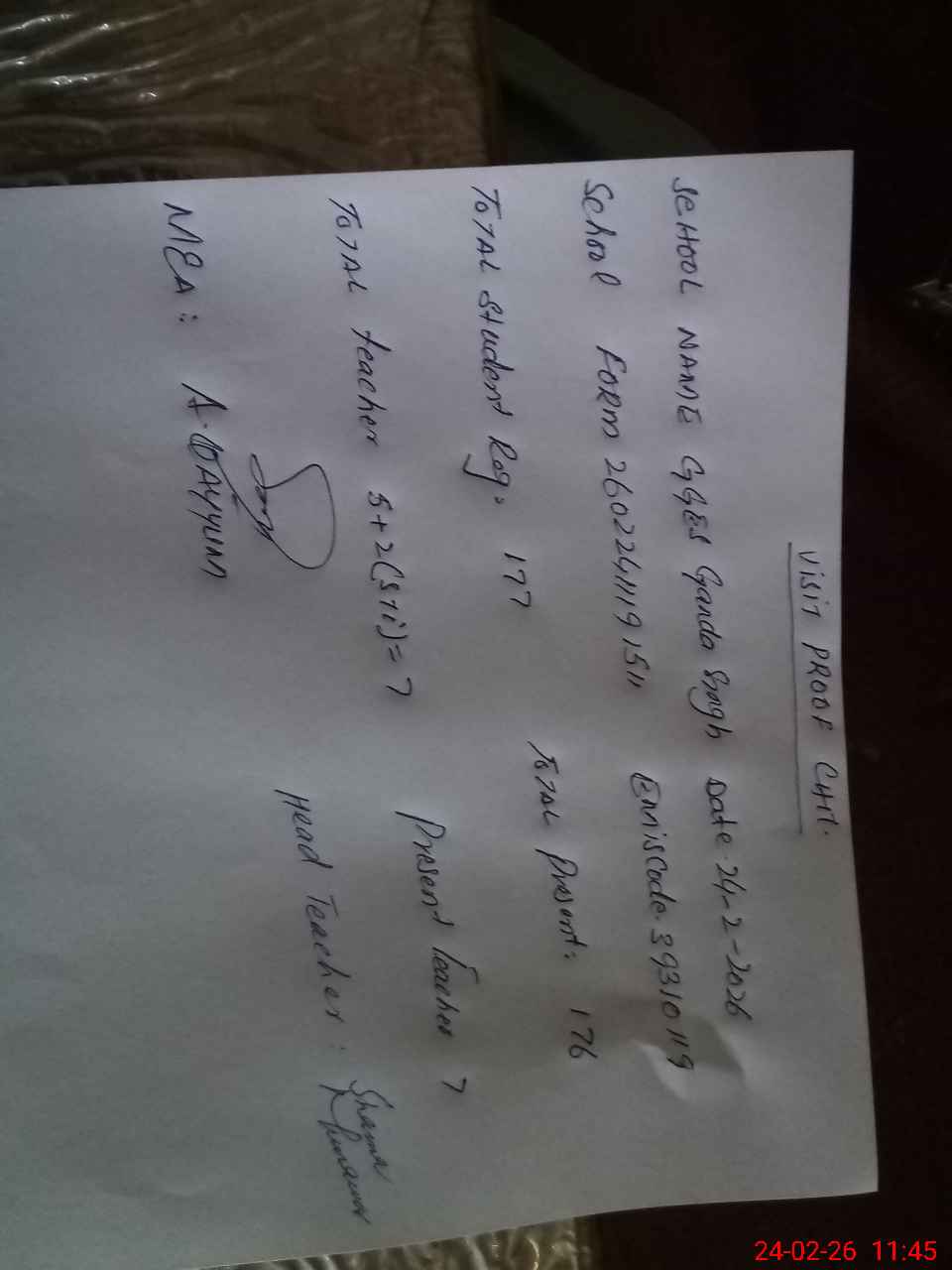 | Attendance Register | Head Teacher | MEA with School | Visit Proof |