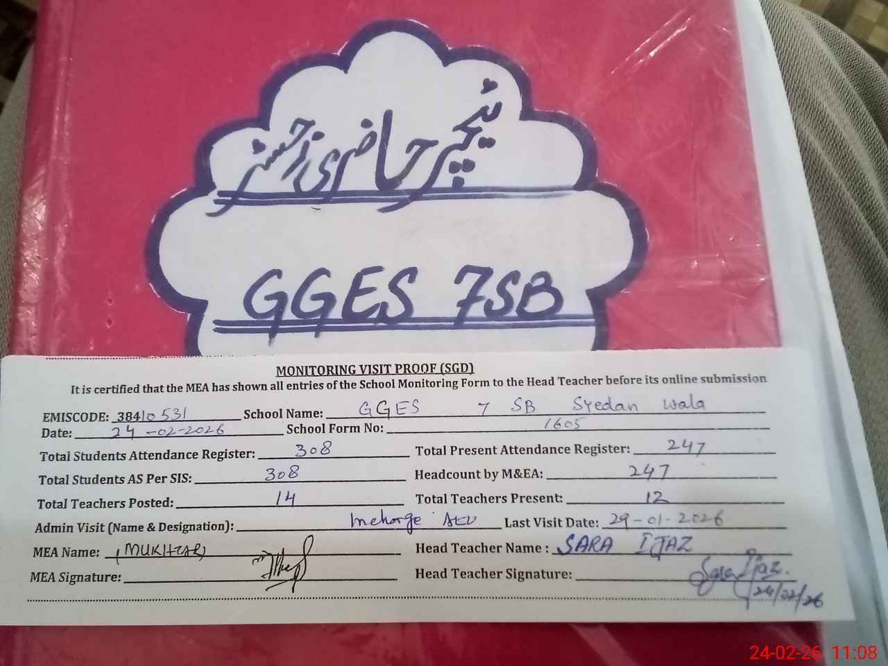 | Attendance Register | Head Teacher | MEA with School | Visit Proof |